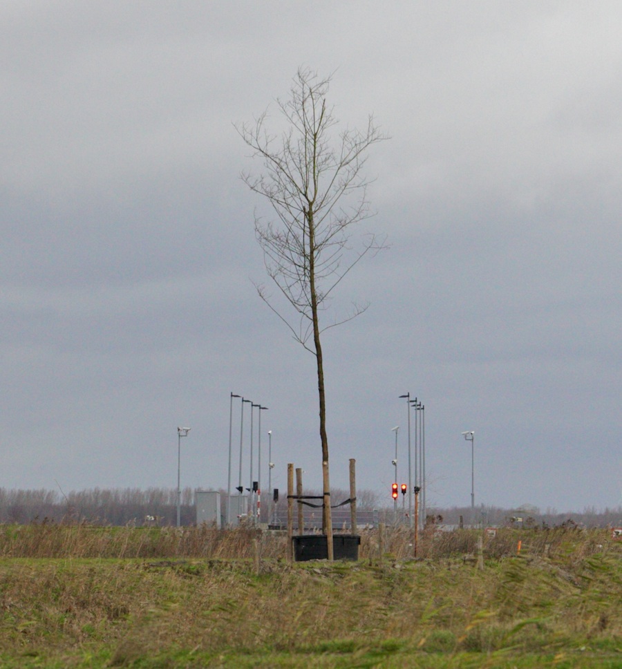 Blaricummer Meent: onlangs is een winnend idee van de ideeëncompetitie Wachtend Land uitgevoerd: op plaatsen die ooit pleintjes zullen zijn in de nog (?) te bouwen wijken, zijn bomen geplaatst.