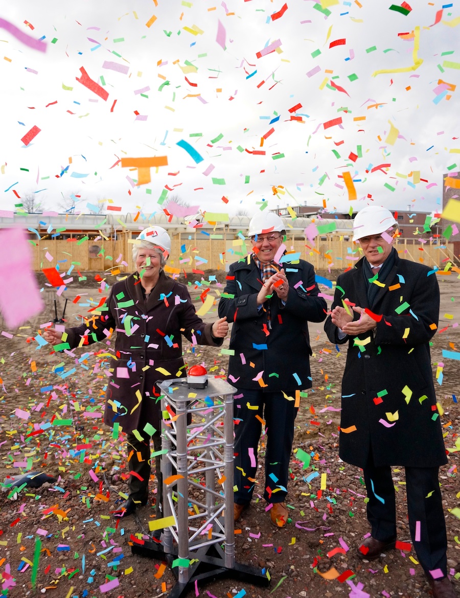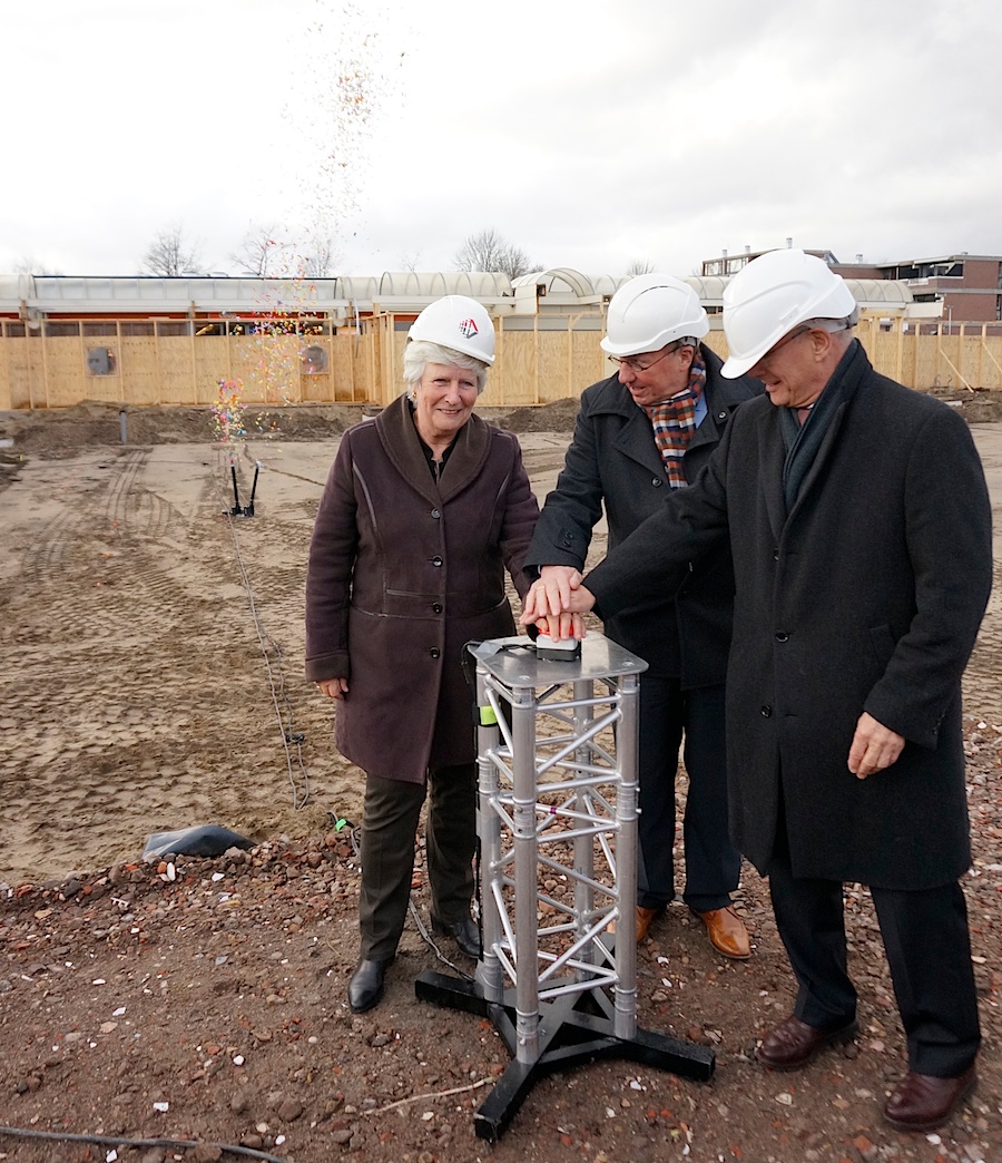 Met een regen van milieuvriendelijke confetti heeft wethouder Annemarie Kennis de her-/nieuwbouw van De Balken vanmiddag van start laten gaan. Heren van Noordersluis Bouwgroep waren haar behulpzaam.