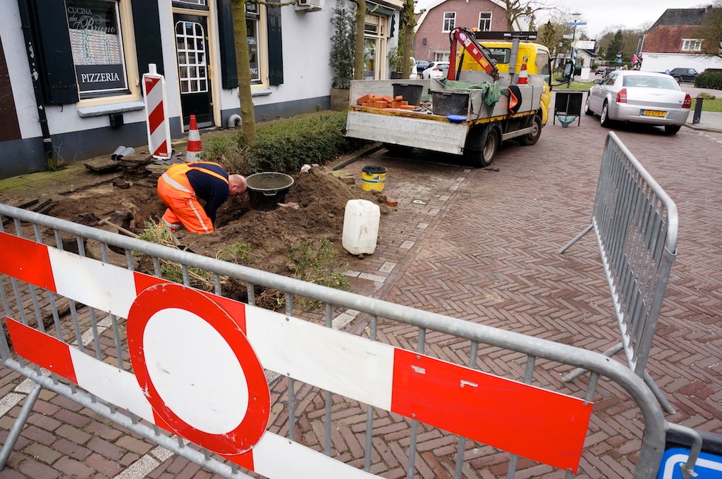Roland Vos van de BEL-buitendienst is vanochtend aan de slag gegaan met de verzakking op de Meentweg. Al gauw bleek wat het probleem was (en de oorzaak van de rattenoverlast): een kapotte verzamelput van het riool. In de loop van de middag is alles weer in orde.