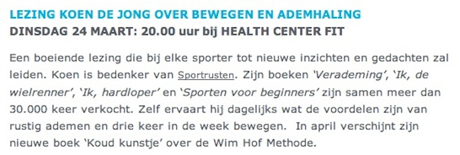 Hoofdpijn, vermoeidheid, gejaagdheid, nekpijn, darmklachten. Koen de Jong (ex prof wielrenner) verteld wat ademhaling hier mee van doen heeft. Zeer leuke en interessante lezing van een iemand die zich hier in het belang van goed ademen verdiept heeft. Entree €15 waarbij je een van zijn boeken ter waarde van €15 mee krijgt.