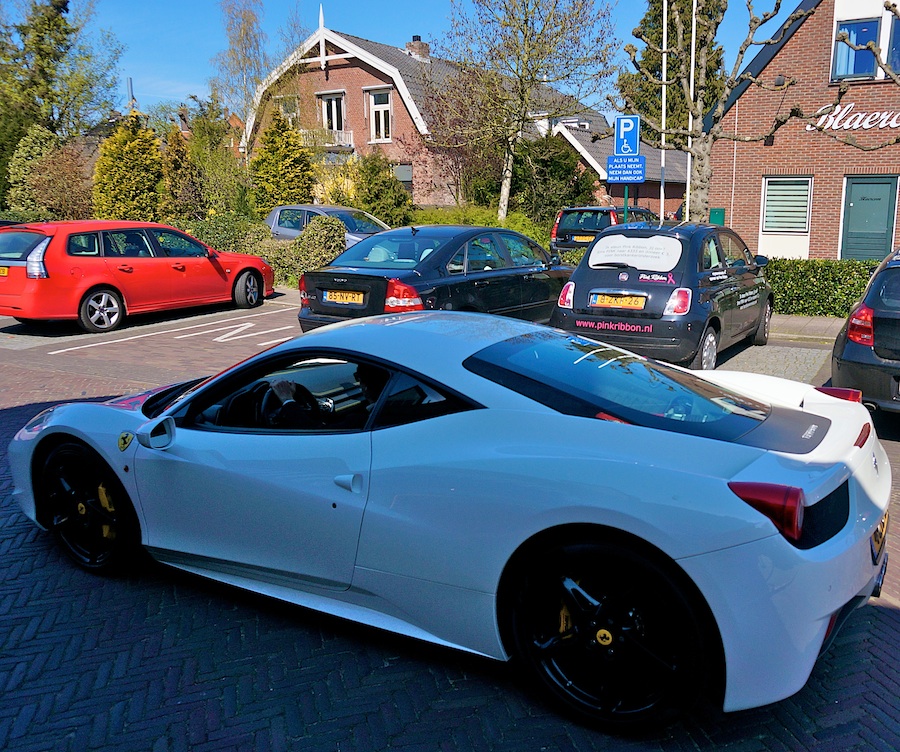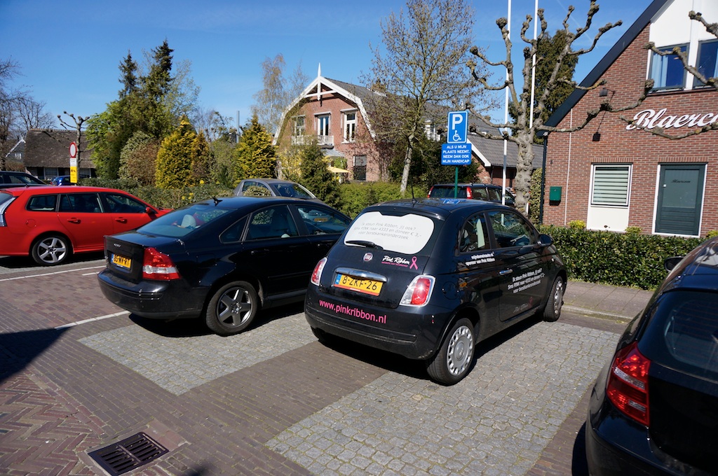 Met die Ferrari is niks mis. Nou ja, rood is echter en toen ‘ie startte vielen de natuur en het Blushing-terras (waar de bestuurder plus dame hadden geluncht) even stil, maar vooruit. Over die Pink Ribbon-500 is te zeggen dat ze dwaas raar staat geparkeerd (2e foto), dat de tekst op de achterruit het uitzicht tot nul reduceert en dat een tekst die oproept tot sms’en (voor een overigens goed doel) juist daar niet thuis hoort. Dan hebben we op de oprit van Blaercom een Volvo die valsspeelt en de kaartloze Volvo op de invalidenplaats werd even eerder door de BOA’s lid gemaakt van de Club van Duurste Bekeuringen – contributie 370 euro. Zo ziet u maar: als je goed kijkt zie je van alles gebeuren.