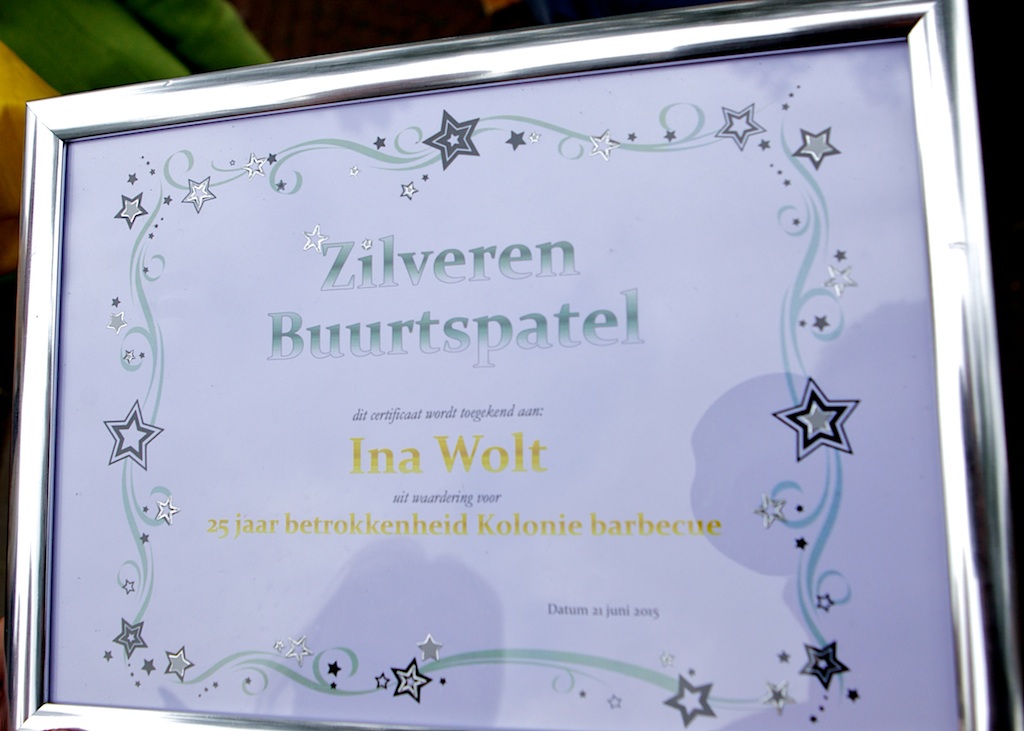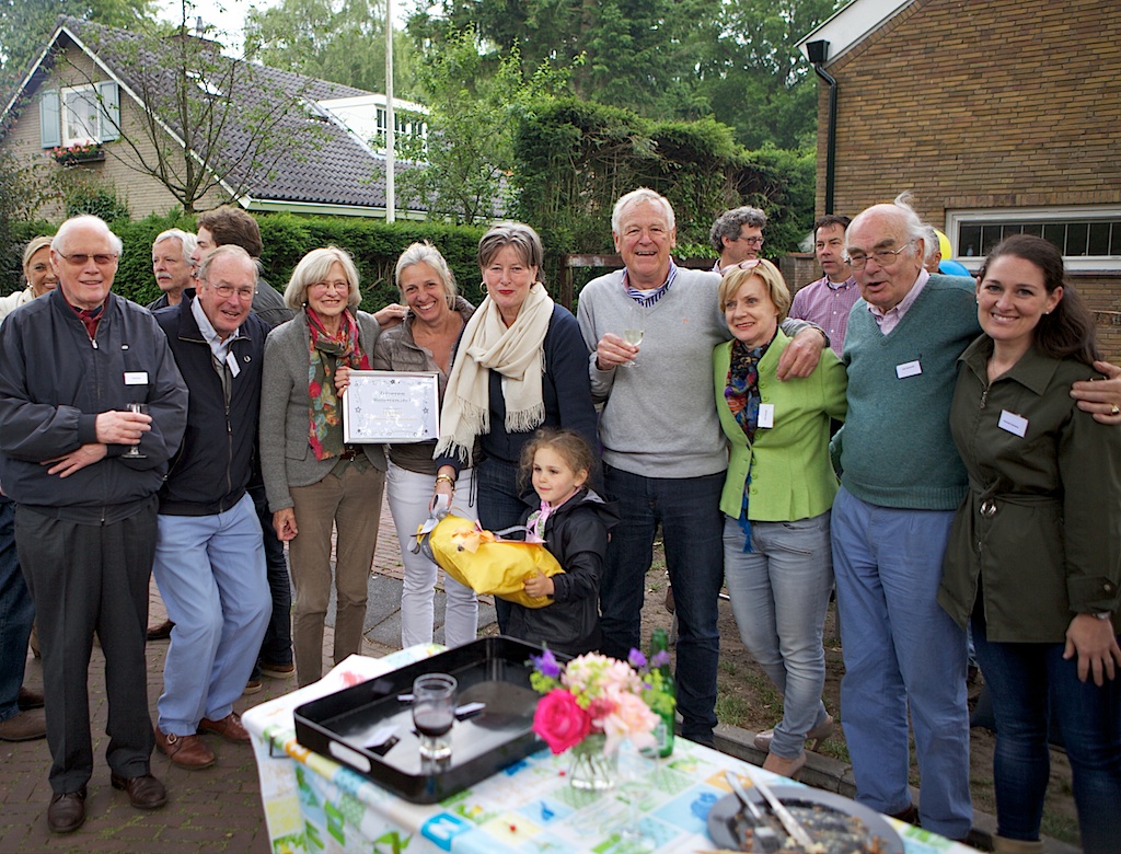 Koloniepad (Blaricum en Laren): vanwege haar inbreng en betrokkenheid bij elke jaarlijkse Koloniepad-buurtbarbecue heeft Ina Wolt (vijfde van links en rechts, met herfstsjaal) bij de 25e editie vanavond de Zilveren Buurtspatel gekregen. Het zal ter plaatse nog lang prosecco blijven regenen …