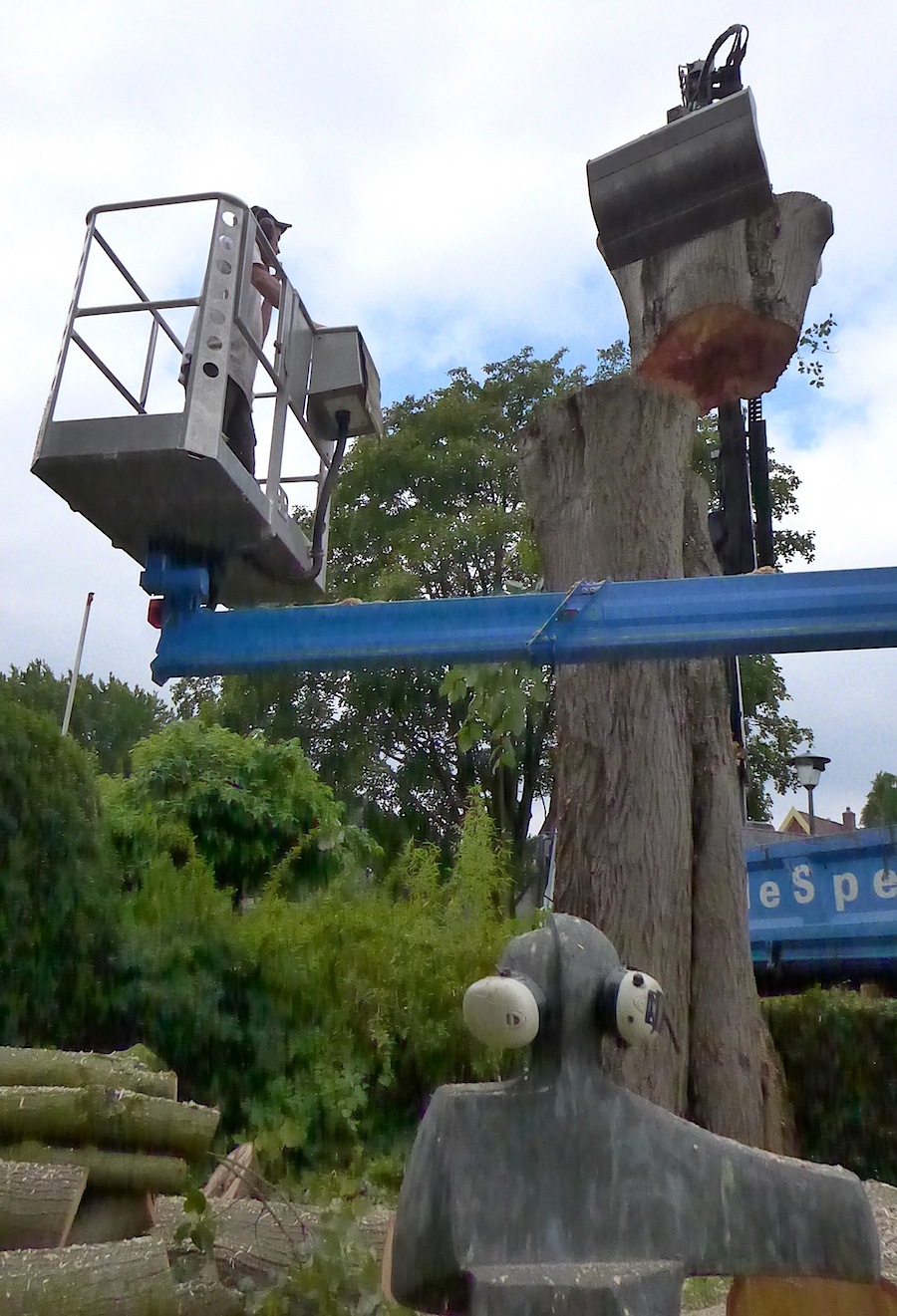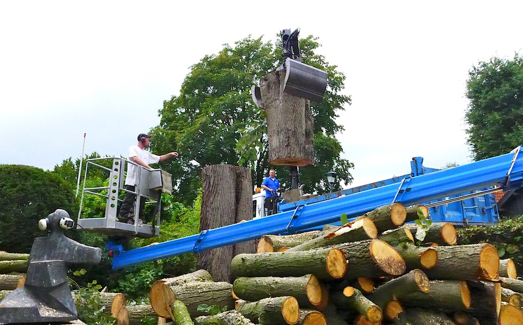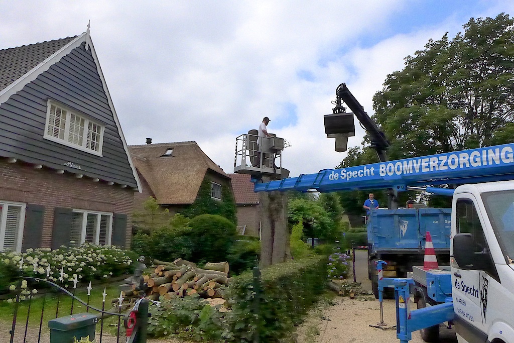 … zal haar einde in een open haard wel vinden. (Noodkap, stam tot vier meter hoogte hol en verrot. Nummer 1 sneuvelde in de recente julistorm.)