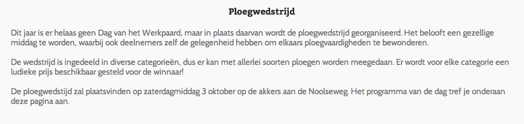 zegt het voort, zegt het voort!!! Fijn Peter, dat je hier even aandacht aan schenkt op jouw site. we hopen dat het een gezellige middag wordt op 3 oktober!! voor nadere informatie kijk op: http://www.dagvanhetwerkpaard.nl gr namens de werkpaarden Ria Roest LikeLike Beantwoorden