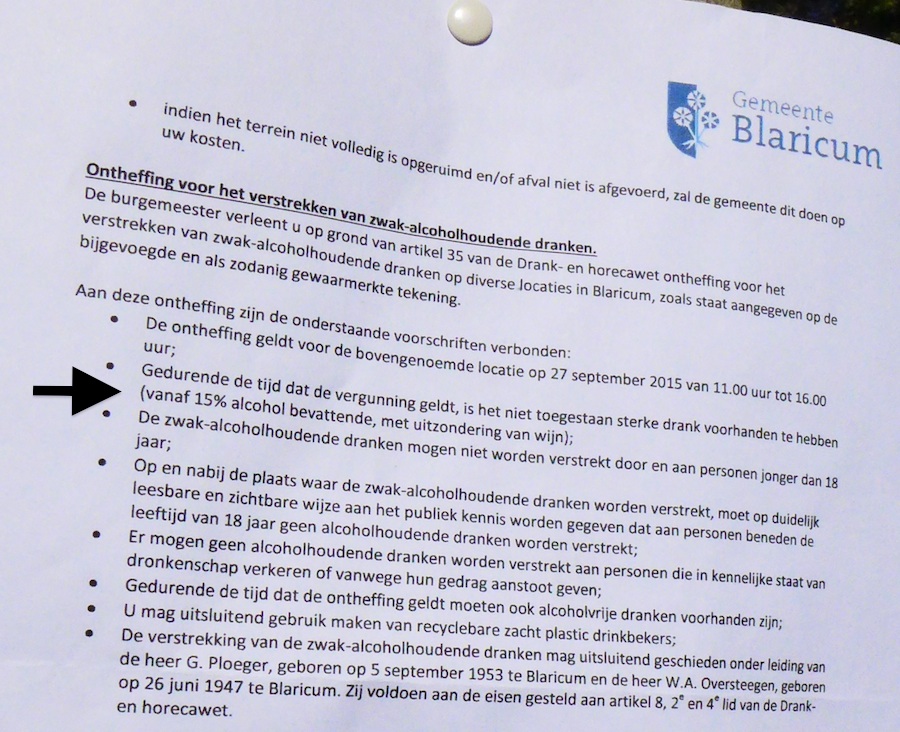 Traditie bij het jaarlijkse Blaricumse Golf en Country is het serveren van haring en een glaasje korenwijn bij de hole van JSR Makelaars aan de Dorpsstraat. Heeft nooit een probleem opgeleverd, integendeel. Dit jaar heeft de gemeente de vergunning afgegeven met onder ander de restrictie dat korenwijn niet meer mag. (Maar dat is dus de vraag met inmiddels een verrassend antwoord! Zie update onderaan.) En aan de haalbaarheid van de laatst genoemde voorwaarde zal ook nog lang worden gediscussieerd.