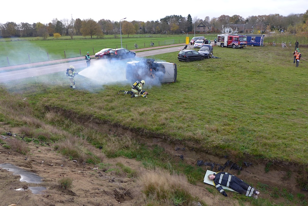 Gisteren vond er aan de Blaricummerweg een onderling wedstrijdje plaats voor BEL-brandweerteams. Het ging om een complexe ‘aanrijding’ met brand en diverse gewonden. Het ‘slachtoffer’ in de sloot werd ook gevonden, zij het dat het ene team daar langer over deed dan het andere.