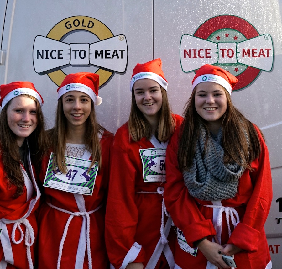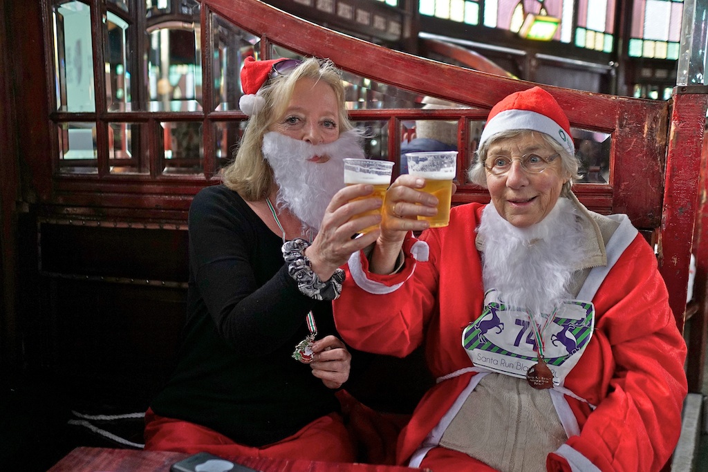 Janne en Marijke die samen bijna net zo oud zijn als de kerstman, na een volle ronde in de kleedkamerspiegeltent een paar welverdiende sapjes tot zich namen.