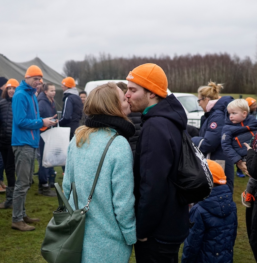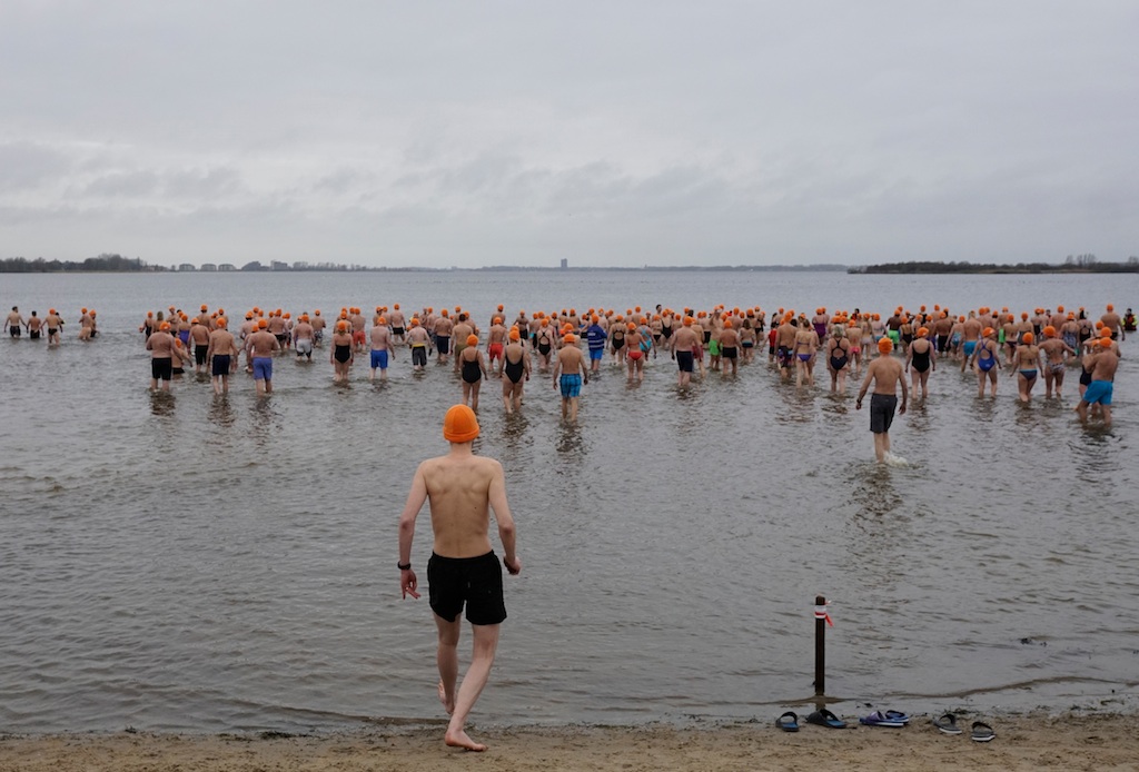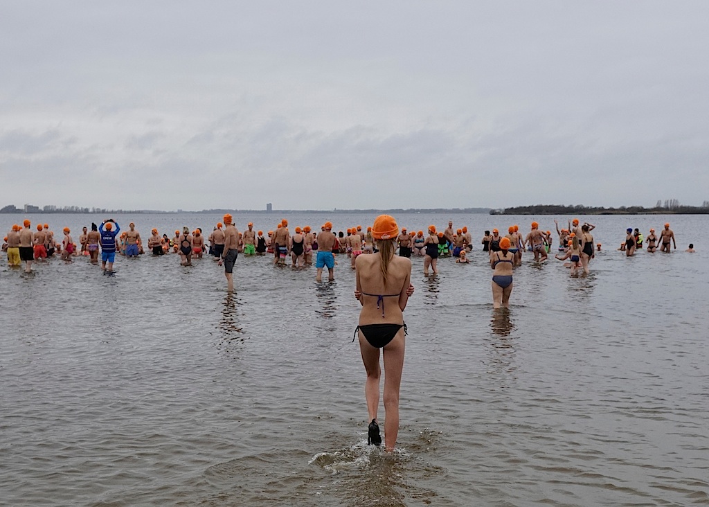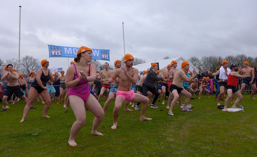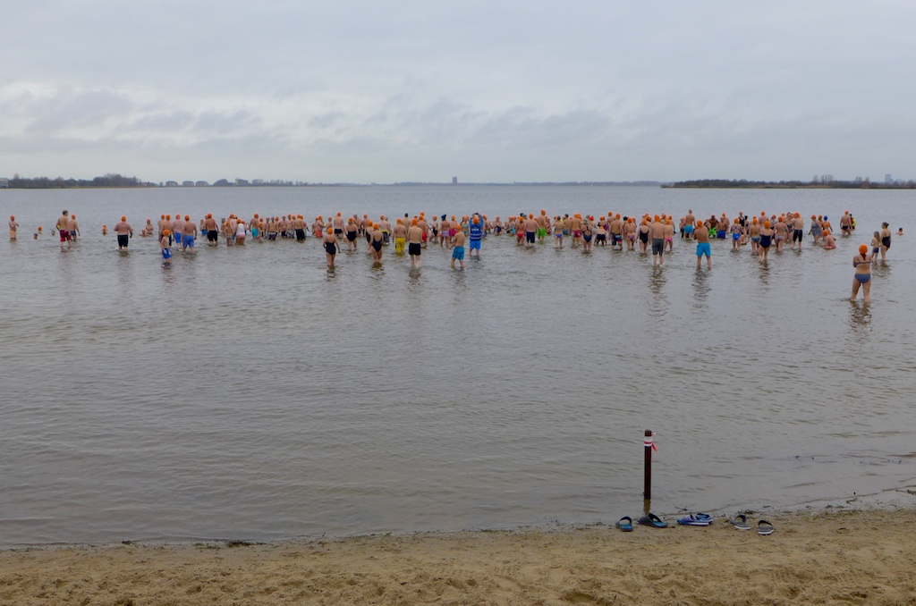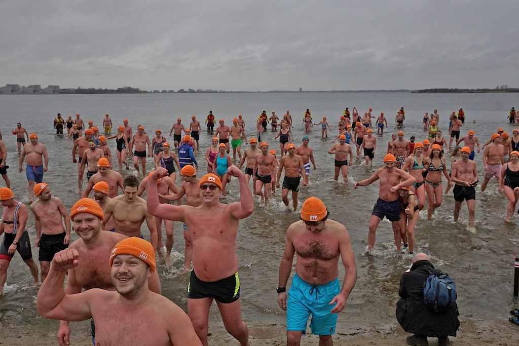 … maar uiteindelijk gingen er zo’n 150 deelnemers (220 à 290 volgens anderen) vijf minuten zitten in het water van 6 graden – …