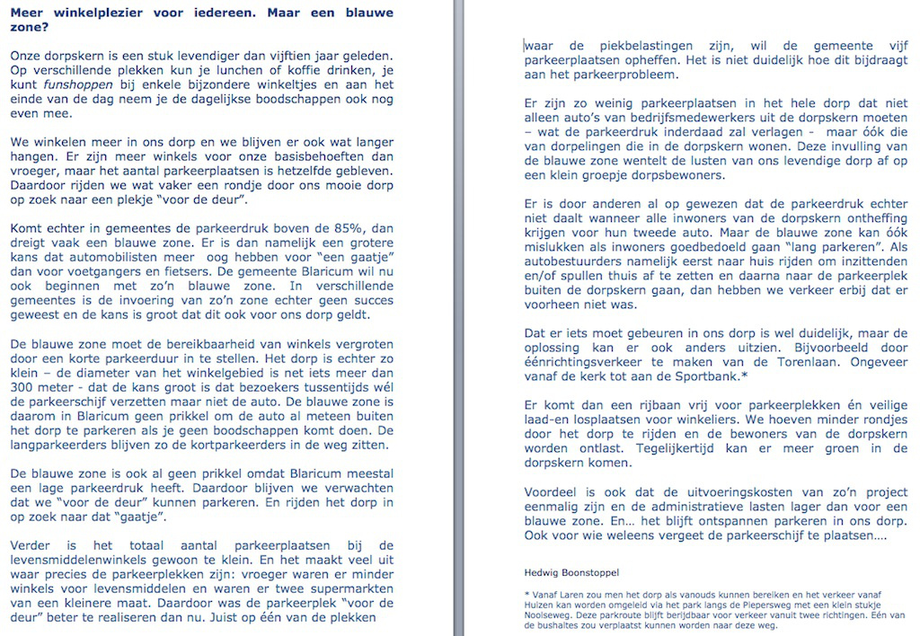 Wethouder Boersen legde vanavond tijdens het ‘inloopmoment’ voor de blauwe zone (‘niet mijn hobby’) nog maar weer eens wat uit. Ze legde ook uit dat als men (…) de blauwe zone niet wil (waartegen de raad in 2011 ja heeft gezegd), dat men dan niet bij het college moet zijn, maar bij de raad. Bijvoorbeeld door op de eerstvolgende RTG in te spreken, door de raad een brief te sturen, en/of door individuele raadsleden te herinneren aan verkiezingsprogramma dan wel -belofte en door raadslieden te voorzien van voortschrijdend inzicht. Van dat laatste is een voorbeeld opgenomen.