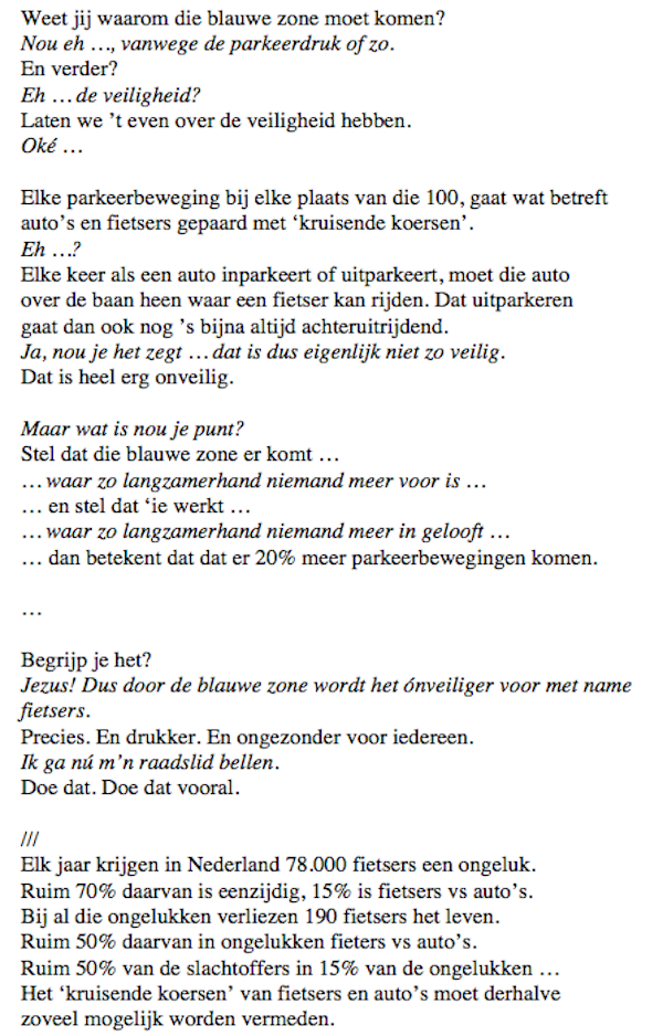 In de raadsvergadering van vanavond zal de VVD een motie indienen om af te zien van de blauwe zone. Moge onderstaande Oog-dialoog bijdragen aan de wijsheid en moed van alle raadsleden.