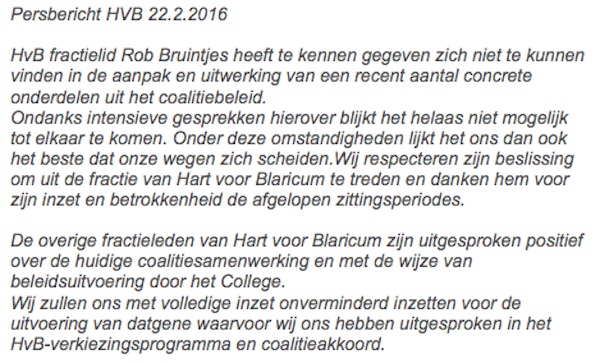 Gisterenavond heeft raadslid Rob Bruintjes zijn lidmaatschap van Hart voor Blaricum opgezegd en