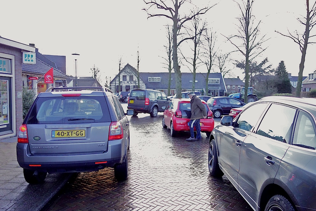 Bij Kruidvat staat al enige tijd een SUV met vier wielen op de stoep, de bestuurder zit te bellen. Tegenover BijJelle staat de rode auto op de rijbaan stil, reden onbekend. Dan loopt de bestuurder van de (later uitparkerende) Range Rover naar de auto. De rode auto rijdt wat vooruit (wil kennelijk de vrijkomende plaats gaan gebruiken), de Audi (rechts) sluit aan. De Range Rover begint uit te parkeren, de rode auto rijdt wat achteruit, de Audi toetert maar rijdt mee achteruit. De voetganger is het wachten zat (stille woensdagochtend in een Goois dorpje, nietwaar?) en begint de overtocht. Hij wordt net niet uit z’n schoenen gereden door de rode auto, net niet gekraakt tussen die auto en de Audi en net niet platgereden door de gehaaste Freelander (links), die kennelijk denkt ‘als alles stilstaat, kan ik er even lekker snel en deels over de stoep tussendoor’. De Range parkeert verder uit, de voetganger slalomt als een Olympisch kampioen naar de relatieve veiligheid van de stoep en als dan de rode auto wil inparkeren, kwakt de SUV met de bellende bestuurder zijn bak dwars over straat en pakt de parkeerplaats. Een paar seconden later is de straat bijna leeg, de Audi heeft de rode auto ingehaald en is net zoals de Range en de Freelander uit beeld en als er dan wat raadsleden waren langsgekomen en die de nog steeds twijfelende rode auto hadden gezien (Schoolstraat, Torenlaan, Binnendoor, Achterom, Huizerweg – overal vrije plekken), dan hadden ze kunnen zeggen: ‘Zie je wel, parkeerprobleem.’ Niet dus, en welterusten (met uitgeschakeld geweten en verstand).