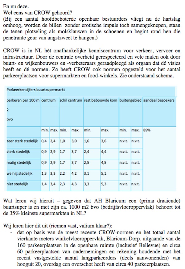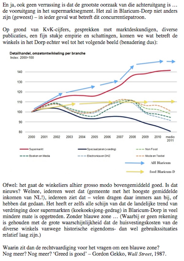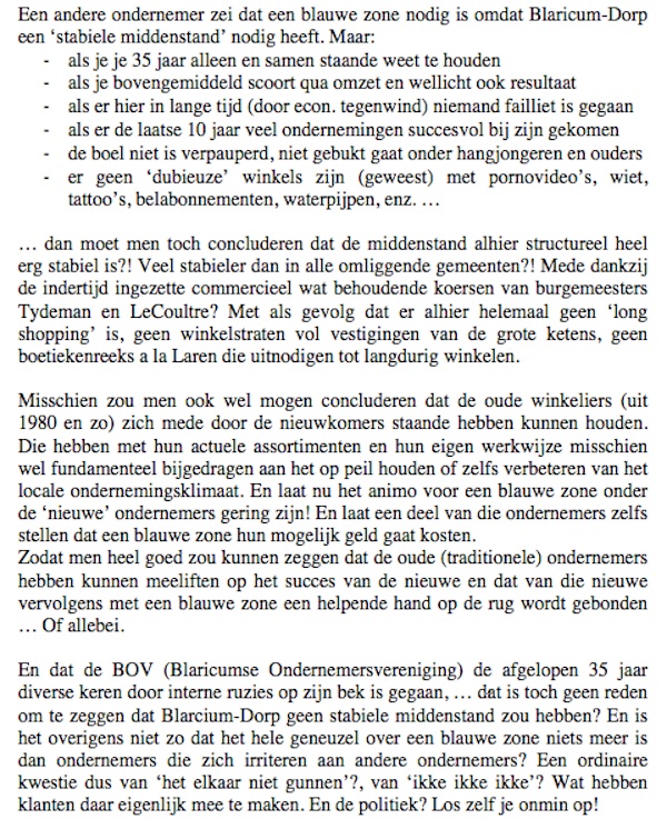 Bij alle cijfers ga jij uit van het Oude Dorp, maar Blaricum is groter dan dat. Voor jou bestaan klanten van buiten Blaricum niet voor deze plaats, je hebt het steeds in je blog over 4000 mensen, maar er zijn er toch echt wel meer. Niet alleen voor de winkels in de food, maar ook voor die in de non-food. Er zijn dus te weinig parkeerplaatsen. Die extra klanten moeten niet afhaken, tenzij onze winkeliers in dezelfde trend als de statistieken van jou terecht willen komen. Vandaar de blauwe zone. Verder zijn de trends gemiddelden waarin ook de winkels zijn opgenomen in krimpgebieden. Blaricum ligt in een gebied dat omgeven wordt door woningbouw. Hoe is jouw stellingname ten aanzien van onze dorpsbewoners in bijvoorbeeld de Bijvanck en de Meent? Mogen die geen boodschappen komen doen in hun eigen plaats? Of moeten die met de kratjes pils en de doos bubbels op de fiets of lopen? Je geeft politici van van alles de schuld. Alsof ze alleen alle beslissingen hebben kunnen nemen. Tegelijkertijd geef je ook aan dat het bestuur zorgt voor stabiliteit. Dat is zelfs in jouw ogen een verdienste en dat lijkt me mede te danken aan de mensen in de politiek die al wat jaartjes meedraaien die gisteren van jou juist maar moesten wegwezen. Als jij al deze jaren ageert tegen een blauwe zone, maakt jou dat dan een steunpunt voor ons collectief of juist een hindernis? Als wij in Blaricum straks gehoord willen worden door een kleinere vertegenwoordiging, lijkt het me handig om anders met elkaar om te gaan en iets sneller bereid zijn tot een overeenkomst. Zeker als het om zulke eenvoudige besluiten gaat als het zetten van een streepje verf op straat.