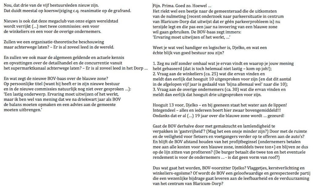 Het bijgaande artikel kopt ‘Nieuwe koers Blaricumse Ondernemers Vereniging’. Nieuw? Hoe, wat, voor wie, wanneer?