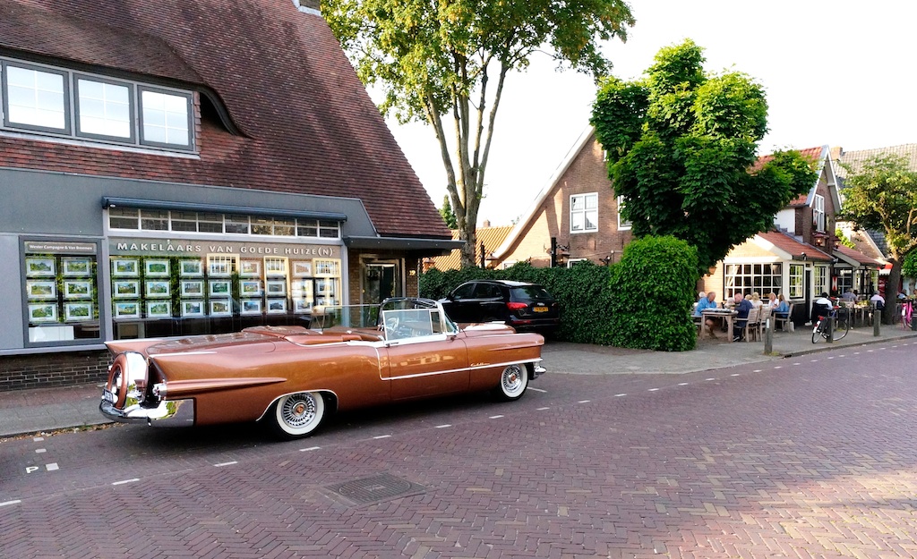 Als ik het goed heb is dat een 1955 Cadillac Eldorado Convertible, met continental kit (= reservewiel + band op de achterbumper).