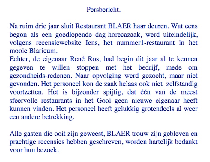 1. Vorig jaar op het laatste moment een executie veiling geannuleerd. Ik ben bang dat dit ook nu enige rede is geweest alleen staat dit nergens vermeld. Voortijdig gestopt waarschijnlijk. Blijft sneu. Erg lekker eten. En wat de heer Lommel ook stelt; als het een goed draaiende zaak was geweest met knappe winst in hartje Blaricum, dan vindt je 100% een nieuwe eigenaar.