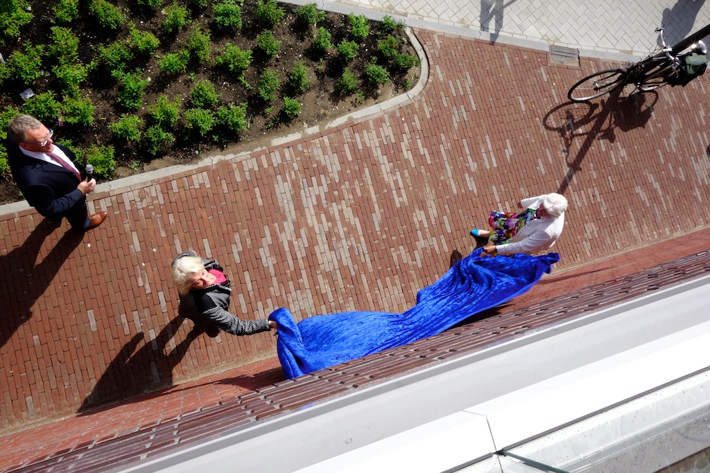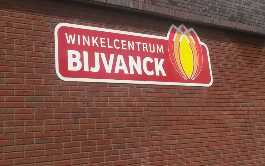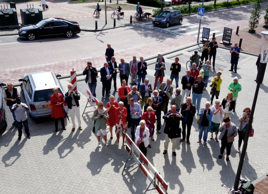 Voor een uitgelaten menigte is vanmiddag Winkelcentrum Bijvanck officieel geopend. Onthullers van dienst waren gedeputeerde Joke Geldhof (links, met dienstbolide bij de vuilniscontainers geparkeerd) en wethouder Anne-Marie Kennis. Achter het blauwe dundoek bevond zich een naamschild dat er volgens oud-raadslid Mieke Bakker maar armzalig uitziet en volgens anderen vooral doet denken aan een flets MacDonald’s-bord. Maaar ten opzichte van de bundel balken (het kunstwerk dat al te vaak leidde tot de grap ‘Is de verbouwing nou nog niet klaar?’) na zoveel jaren toch een flinke verbetering. Verrassend genoeg heeft de fotograaf van dienst vergeten van het naamschild een foto te maken.