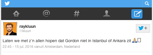 Berichten over coup in Turkije … Oog op Blaricum nieuws 15 juli 2016 … en de eerste graptweet is er ook al: Delen kan hier: Share op Facebook (Opent in een nieuw venster) Facebook Delen op X (Opent in een nieuw venster) X Email a link to a friend (Opent in een nieuw venster) E-mail Afdrukken (Opent in een nieuw venster) Print Delen op WhatsApp (Opent in een nieuw venster) WhatsApp Meer Share on Threads (Opent in een nieuw venster) Threads Vind-ik-leuk Aan het laden... Gerelateerd Gepubliceerd door Oog op Blaricum Bekijk alle berichten van Oog op Blaricum Gepubliceerd 15 juli 2016