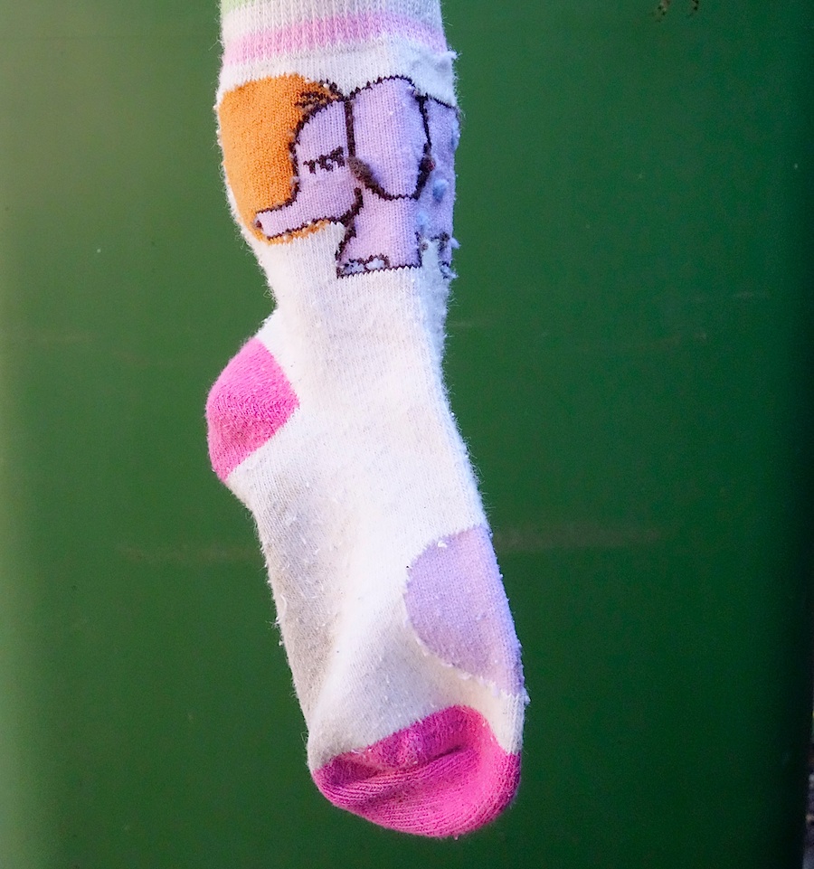 Hoe komt dit sokje in de Oog-achtertuin terecht – ruim 12 meter van het toegangshekje, geen baby’s noch dreumessen op bezoek bij de buren? Een ekster? Een ooievaar die moest hoesten? Af te halen. Zo niet, dan gaat het op 24 december aan de schoorsteenrand en indien ongevuld een dag later de open haard in.