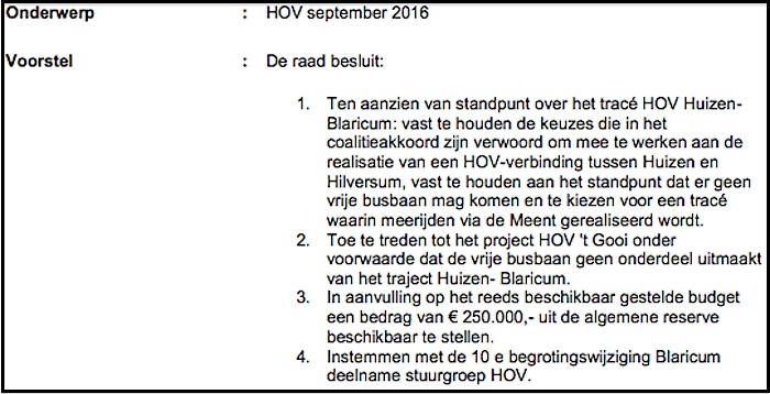 Bijgaand het HOV-voorstel zoals dat op de site van de gemeente staat – hoe krijgt men het voor elkaar het misschien wel sinds jaren meest belangrijke, controversiële en ingrijpende voorstel zó infantiel te formuleren (M.n. punt 1.)?! Welk een belediging van inwoners en van de taal. Kan het openbaar bestuur hier dan werkelijk helemaal niets in één keer goed doen?!