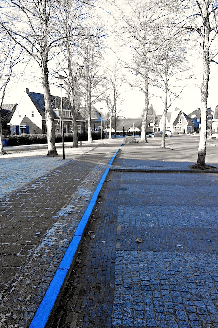 Oog: ja, gisterenochtend (zondag) toen de foto werd gemaakt, was de Schoolstraat ook leeg … en ook dus door blauwe verf vervuild