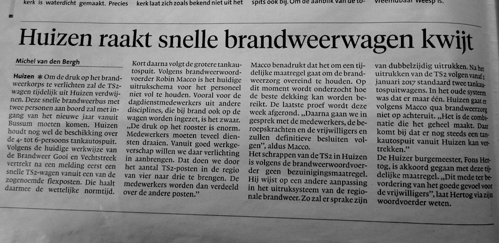 2014: grote onrust bij Brandweer Blaricum. De tweede TAS-6 moest worden ‘uitgenomen’, daarvoor in de plaats (…) kwam een TAS-2 vanuit Huizen. Zou allemaal veel veiliger worden, veel efficiënter, enzovoort. De hele politiek (ja ja ..) stond op haar achterste benen, motie zus, motie zo. Maar die TAS verdween – en bij herhaling bleek dat Brandweer Blaricum met z’n TAS-6 toch sneller ter plaatse was dan die ‘snelle’ TAS-2 uit Huizen. Voorbeeld hier.