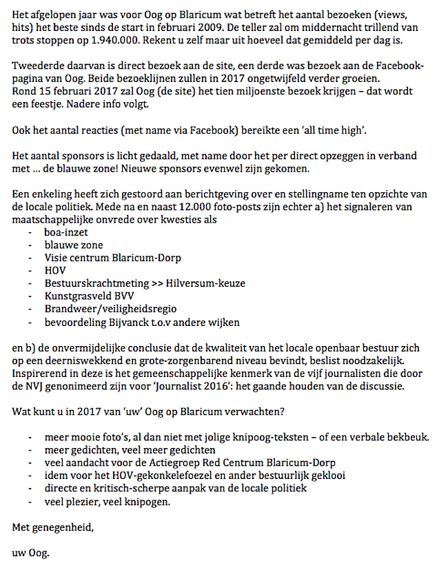 Als inwoner van Eemnes kijk ik elke dag op de site Oog op Blaricum. Ik geniet van de mooie foto’s en lees zijn vaak ingetogen, soms hilarisch en een enkele keer zijn vilein over het wel en wee in Blaricum. Maar altijd vanuit een interne betrokkenheid.