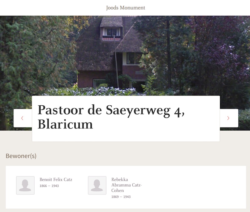 Inmiddels is het volgende gebleken uit een lijst ‘In de gemeente Blaricum wonenden Joden, hoofden van gezinnen’ die afkomstig is van het NIOD en waarschijnlijk door de Duitsers is opgesteld dd. 21 maart 1942: ‘Benoit Felix Catz, Pastoor de Sayerweg 4, Blaricum.’ Bekend is dat Catz eerst op Zwaluwenweg 3 heeft gewoond (praktijk en apotheek) en daarna in het door architect Rueter getekende Torenlaan 15. Onduidelijk is hoe en wanneer en waarom hij op het adres in kwestie is terecht gekomen.