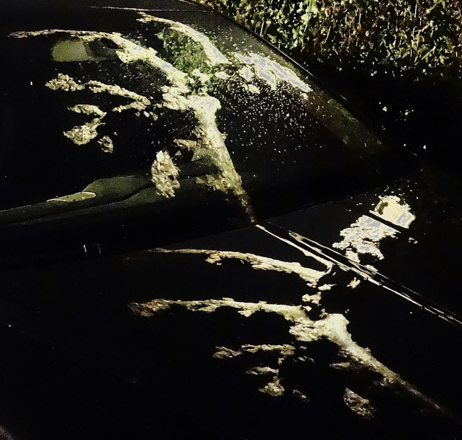 een zeer aparte foto van een eveneens zeer aparte reflectie op een voorruit en motorkap van een geparkeerde auto.