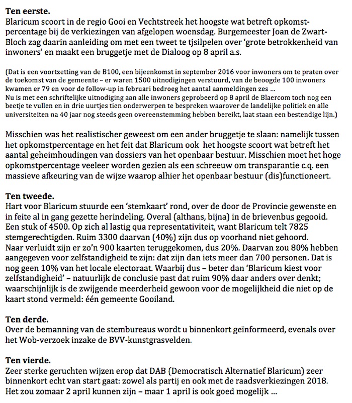 Opkomsten (of afgangen) Oog op Blaricum kwesties, nieuws, opinie 19 maart 2017 Delen kan hier: Share op Facebook (Opent in een nieuw venster) Facebook Delen op X (Opent in een nieuw venster) X Email a link to a friend (Opent in een nieuw venster) E-mail Afdrukken (Opent in een nieuw venster) Print Delen op WhatsApp (Opent in een nieuw venster) WhatsApp Meer Share on Threads (Opent in een nieuw venster) Threads Vind-ik-leuk Aan het laden... Gerelateerd Gepubliceerd door Oog op Blaricum Bekijk alle berichten van Oog op Blaricum Gepubliceerd 19 maart 2017
