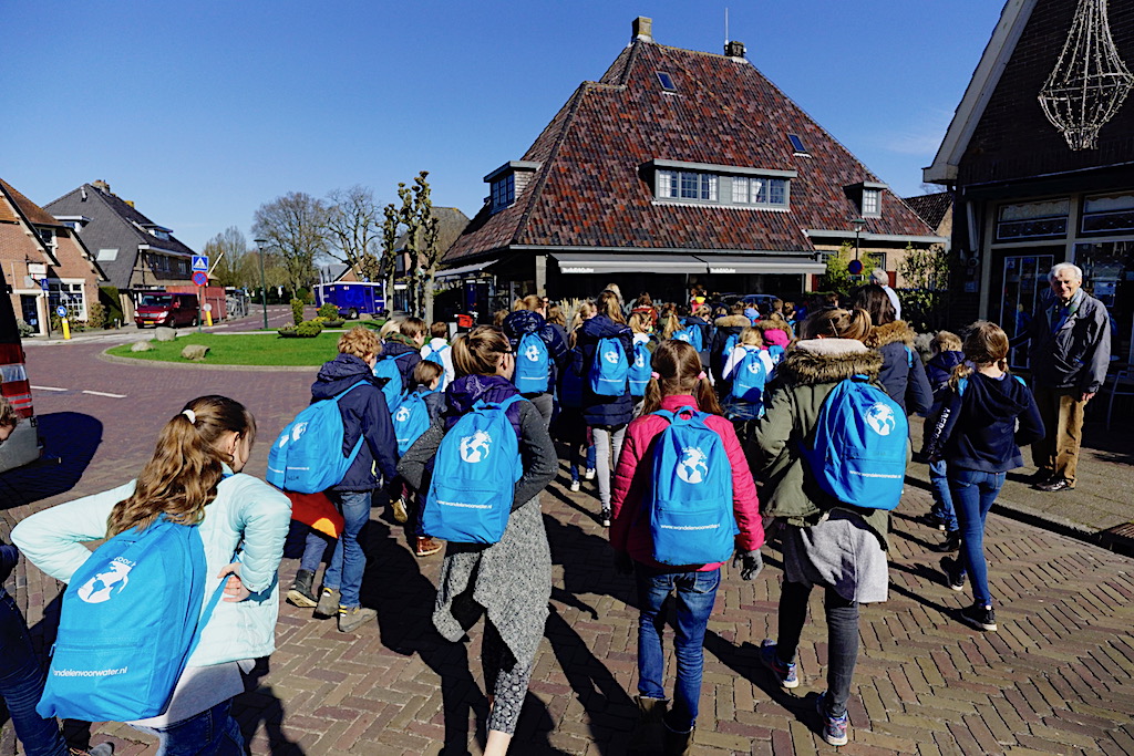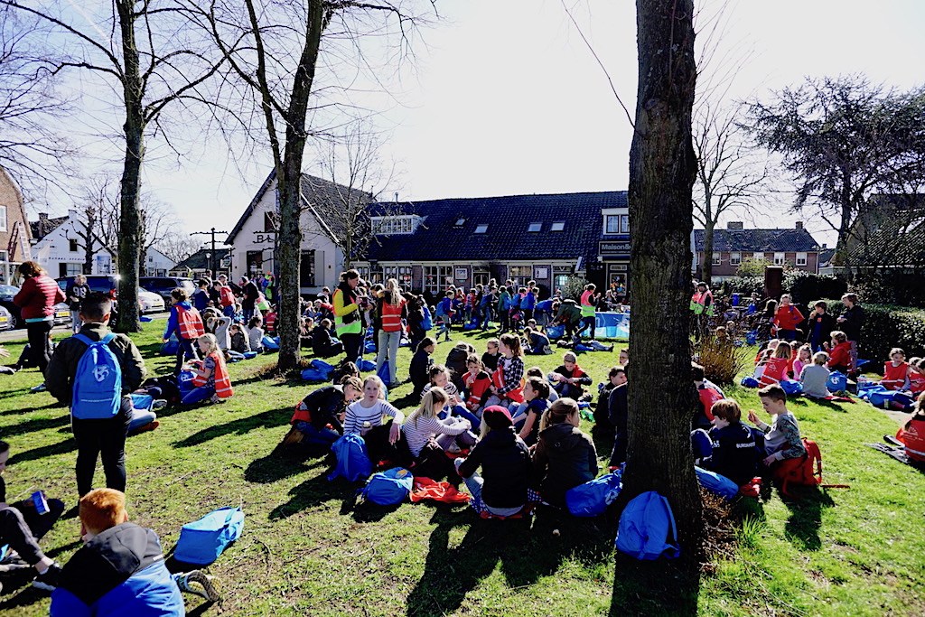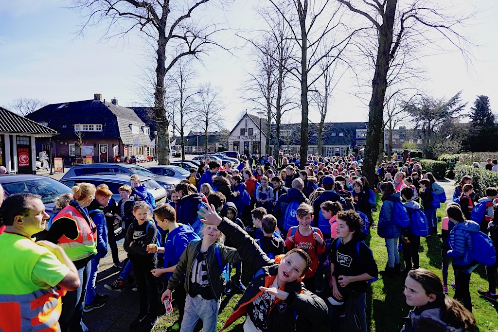 Uit Laren lopen in totaal 235 leerlingen mee van de Montessorischool, Binckhorst-St. Jan, De Ploeg en De Gooische School. Die hadden in de Dorpsstraat een pauze – om wat water te drinken en zo.