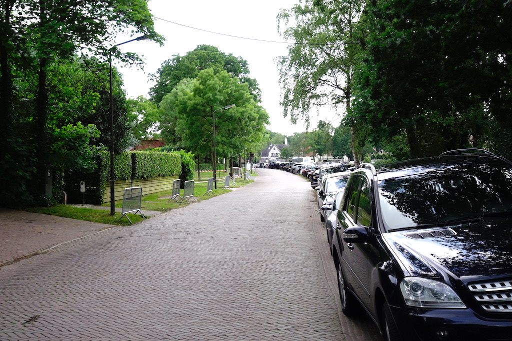 Antwoord: ‘Aan de linkerkant (op de foto) zijn ILLEGAAL de bermen op on-Blaricumse wijze gecultiveerd en mede omdat (toenmalige) aanwonenden geen auto’s van anderen voor hun terrein believen, is het geregeld (…) zoals het is geregeld. De parkeerlast is daarmee volledig afgewenteld op de zwaksten in het verkeer: de voetgangers, de rollators, de invalidenstoelen, de fietskindertjes.’