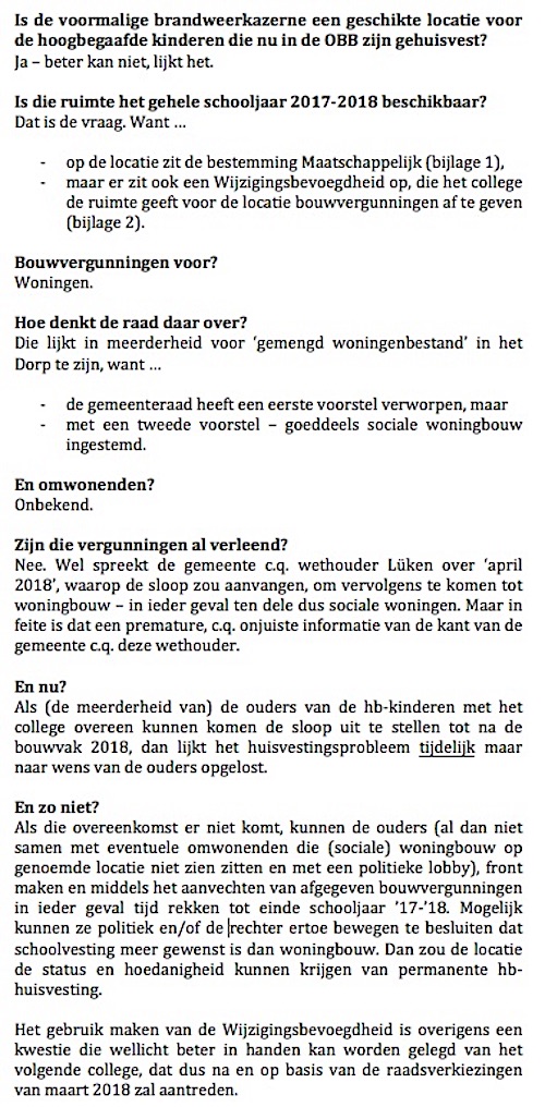 Wat nou zo erg is, is dat je steeds minder vertrouwen in de politiek krijgt. Zo iets simpels, het kost de gemeente niets, kan er dan niet eens samengewerkt worden om dit soort schrijnende zaken snel op te lossen en een beetje mee te denken in het belang van kinderen notabene! En heeft de politiek nu werkelijk de illusie dat wij als omwonenden zitten te wachten op sociale woningbouw voor ons neus? Dus wacht u nog maar even met de sloop, want zover laten we het niet komen. Laat die kinderen gewoon lekker op hun school blijven, geef ze de ruimte in de kazerne en doe nu voor een keer iets goeds. Wees een voorbeeld voor kinderen, lijkt me veel belangrijker.