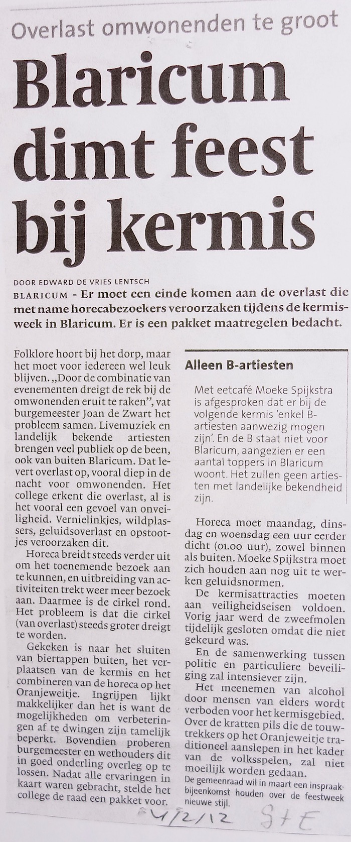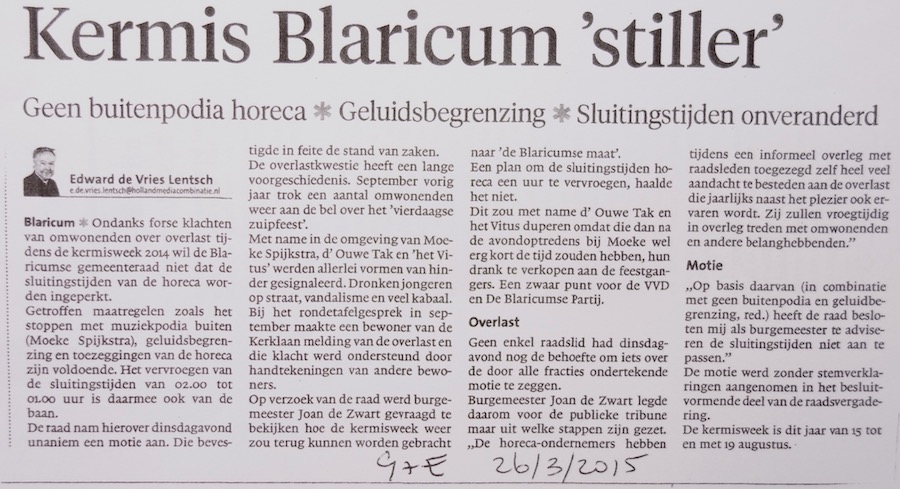 1. Beste Stef, we ergeren ons niet -en ik woon hier al heeeeel lang en de kermis was altijd het feest van het jaar- maar als je in de driehoek moeke/tak/vitus woont heb je te maken met vernielingen, opstootjes, geschreeuw in je straat tot 4 uur ’s nachts, je mag je auto niet in je straat parkeren, ze komen je tuin in pm te plassen enzo . Dat is geen ergernis maar overlast. Daarnaast is er tot 1 uur keiharde muziek bij Moeke met echt teveel decibellen en bassen die de ruiten in je kozijnen laten rinkelen. Die decibellen zouden verminderd worden, de geluidsoverlast wordt echt steeds erger. De Oranjevereniging doet geweldig haar best om de Blaricumse feesten te organiseren maar deze feesten worden deels overschaduwd door de optredens bij Moeke, die veel volk van buiten aantrekken en die het geluid van de artiesten bij de Muziektent overschreeuwen zoals op Koningsdag. Waarom zo hard? En ja….pas na de optredens van Hazes, Roelvink en Brace vertrekken ze pas naar Vitus…..na 23.00 uur,laat dus.