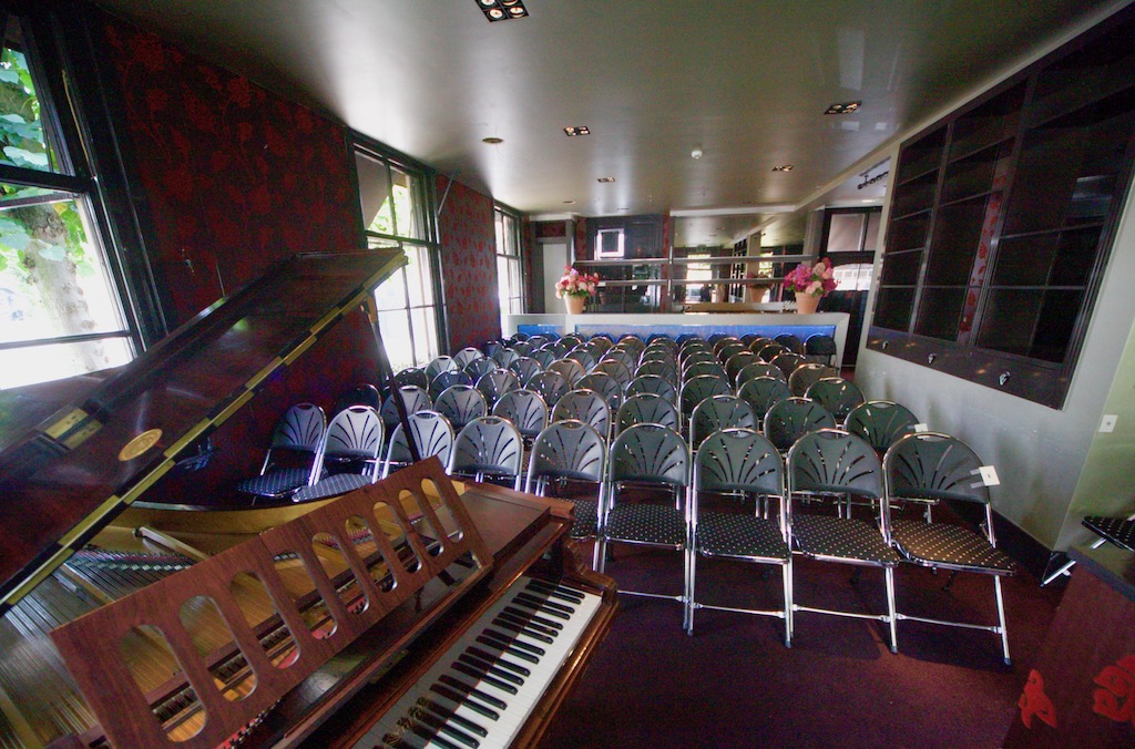 … met voor zo’n honderd genodigden een pianorecital in het voormalige restaurant aan de overkant …