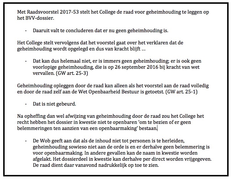 PS. De raad dient derhalve te voorkomen dat het College misbruik blijft maken van de aanwezigheid van een naam in het dossierdeel. Voor zover dat nodig is dient de raad te eisen dat het document – al dan niet met afgelakte naam – woensdagochtend om 09:00 uur onverkort en zonder enig voorbehoud of beperking voor een ieder beschikbaar is.