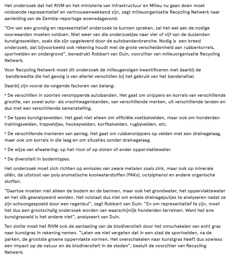 Niet alleen van de kant van de bandenindustrie, maar ook vanuit ‘ons eigen BVV’ wordt gesteld dat de bezorgdheid over de gezondheidszorg- en milieu-effecten niets meer is dan een hetze … Wie het onderstaande leest, zal alleen maar kunnen concluderen dat grote bezorgdheid over kunstgras op basis van rubbergranulaat terecht is.