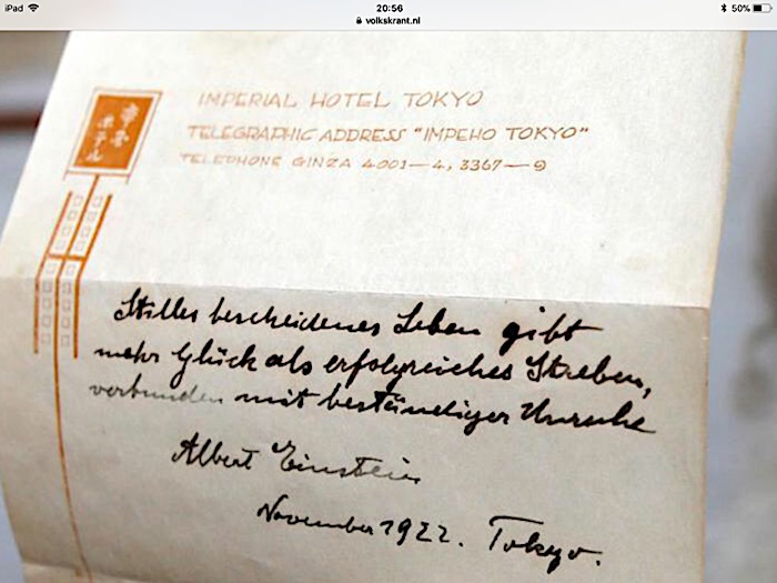 Bijna onbetaalbare wijsheid Oog op Blaricum leven, nieuws 26 oktober 2017 ‘Een stil, bescheiden leven geeft meer geluk dan het streven naar succes, onder voortdurende onrust.’ Briefje veranderde gisteren op veiling van eigenaar voor € 1,56 mln. Delen kan hier: Share op Facebook (Opent in een nieuw venster) Facebook Delen op X (Opent in een nieuw venster) X Email a link to a friend (Opent in een nieuw venster) E-mail Afdrukken (Opent in een nieuw venster) Print Delen op WhatsApp (Opent in een nieuw venster) WhatsApp Meer Share on Threads (Opent in een nieuw venster) Threads Vind-ik-leuk Aan het laden... Gerelateerd Gepubliceerd door Oog op Blaricum Bekijk alle berichten van Oog op Blaricum Gepubliceerd 26 oktober 2017