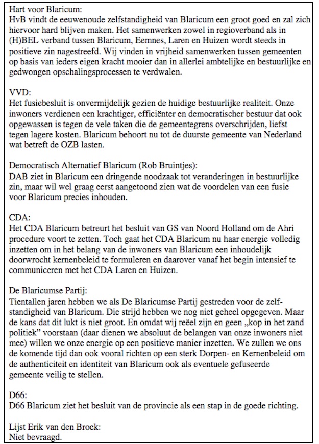 De Gooi en Eemlander tekende de meningen op van de Blaricumse politiek over de door de Provincie gewenste fusie met Laren en Huizen. De krant concludeert dat HvB tegen is en de rest (aarzelend) niet tegen.