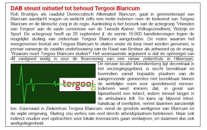 Ook in de gemeenten Weidemeren, Huizen, Laren en Eemnes krijgt, de dreigende sluiting van Tergooi Blaricum, steeds meer aandacht..