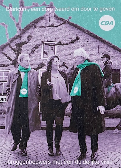 Uw grootouders hebben mogelijk een keer een schoolreisje naar Engeland gemaakt en daar in een klein achterafdorpje een voorstelling bijgewoond van een koddig kluchtig toneelstuk dat zich afspeelde in het midden van de 19e eeuw. Daar doet deze poster heftig aan denken. Intrigerend is aan wie of wat het CDA het dorp wil doorgeven … houdt het CDA ermee op? Intrigerend is ook de kwaliteit van bruggenbouwers: tussen Crailo en de Meent? Tussen Bierweg en Buizerd? Spannend. Of komt het woord (net zoals samenleving en gemeenschapszin) uit het reservoir van best wel moeilijke woordspelletjes waar de partij zich graag met een kopje thee of een glaasje port mee bezighoudt?