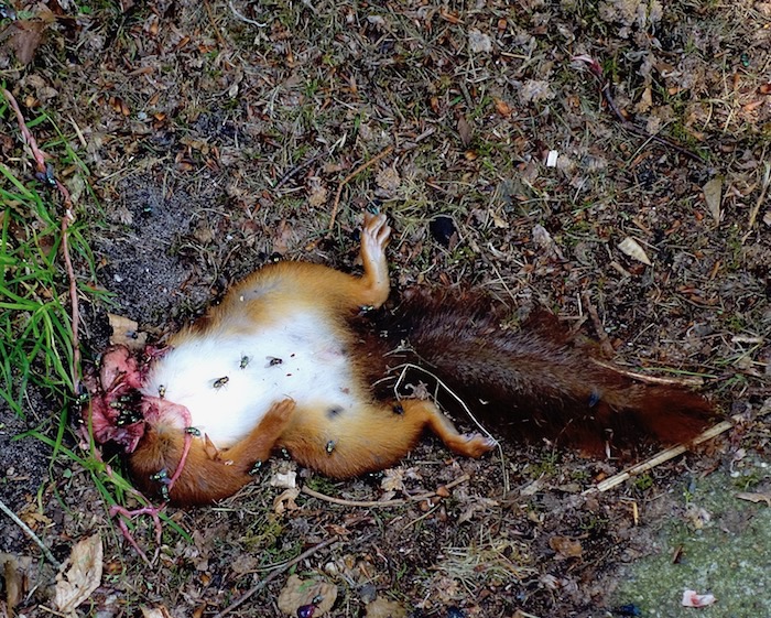 Bekend. Dit is typerend voor een door een kat of marter doodgebeten eekhoorn. Hals doorbijten, dood en kop eraf. ‘Da’s de natuur’ bromde mijn buurman.