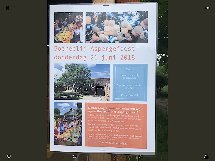 Nog één keer asperges – van éigen akker? Oog op Blaricum bijeenkomsten, cultuur, nieuws, zaken 19 juni 2018 Delen kan hier: Share op Facebook (Opent in een nieuw venster) Facebook Delen op X (Opent in een nieuw venster) X Email a link to a friend (Opent in een nieuw venster) E-mail Afdrukken (Opent in een nieuw venster) Print Delen op WhatsApp (Opent in een nieuw venster) WhatsApp Meer Share on Threads (Opent in een nieuw venster) Threads Vind-ik-leuk Aan het laden... Gerelateerd Gepubliceerd door Oog op Blaricum Bekijk alle berichten van Oog op Blaricum Gepubliceerd 19 juni 2018