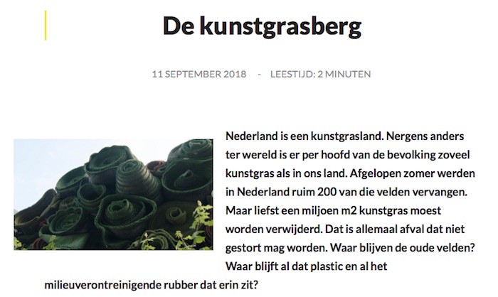 ‘Aannemingsbedrijf Vink in Barneveld is sinds een jaar in overtreding, als het gaat om de opslag en recycling van kunstgras. Volgens de onderzoekers zijn er grote problemen met de recycling van de velden, die op grote stapels op bedrijfsterreinen liggen zonder de juiste vergunning. Toezichthouders zouden de illegale situatie gedogen, omdat men niet zou weten waar anders met het afval heen te moeten. Volgens voormalig milieuofficier en bijzonder hoogleraar milieurecht G. A. Biezeveld is dit ‘moedwillig de zaak vervuilen ter wille van winst’. ‘Ten koste van het milieu wordt hier op een gemakkelijke manier geld verdiend. Ik vind dat misdaad niet mag lonen, en dit is misdadig. Er wordt hier niet gehandhaafd.’