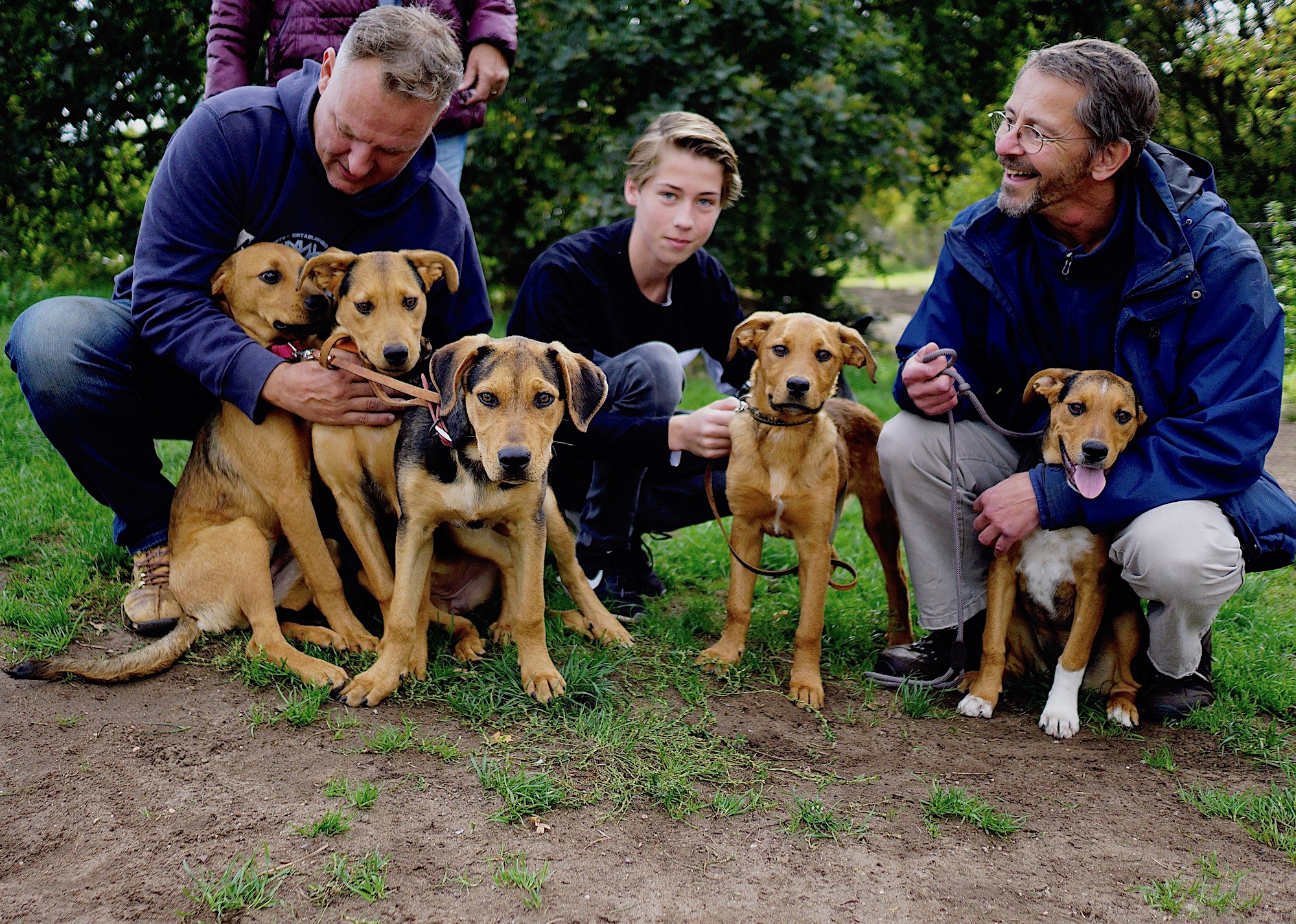 De Rhodos 5 (verhaal hier) hadden vanmiddag een partijtje op ’t Harde. De vijfde hond (Apollo, reu – is nog beschikbaar voor adoptie) is afgelopen nacht van Schiphol opgehaald, dus het complete spul kon op de foto.