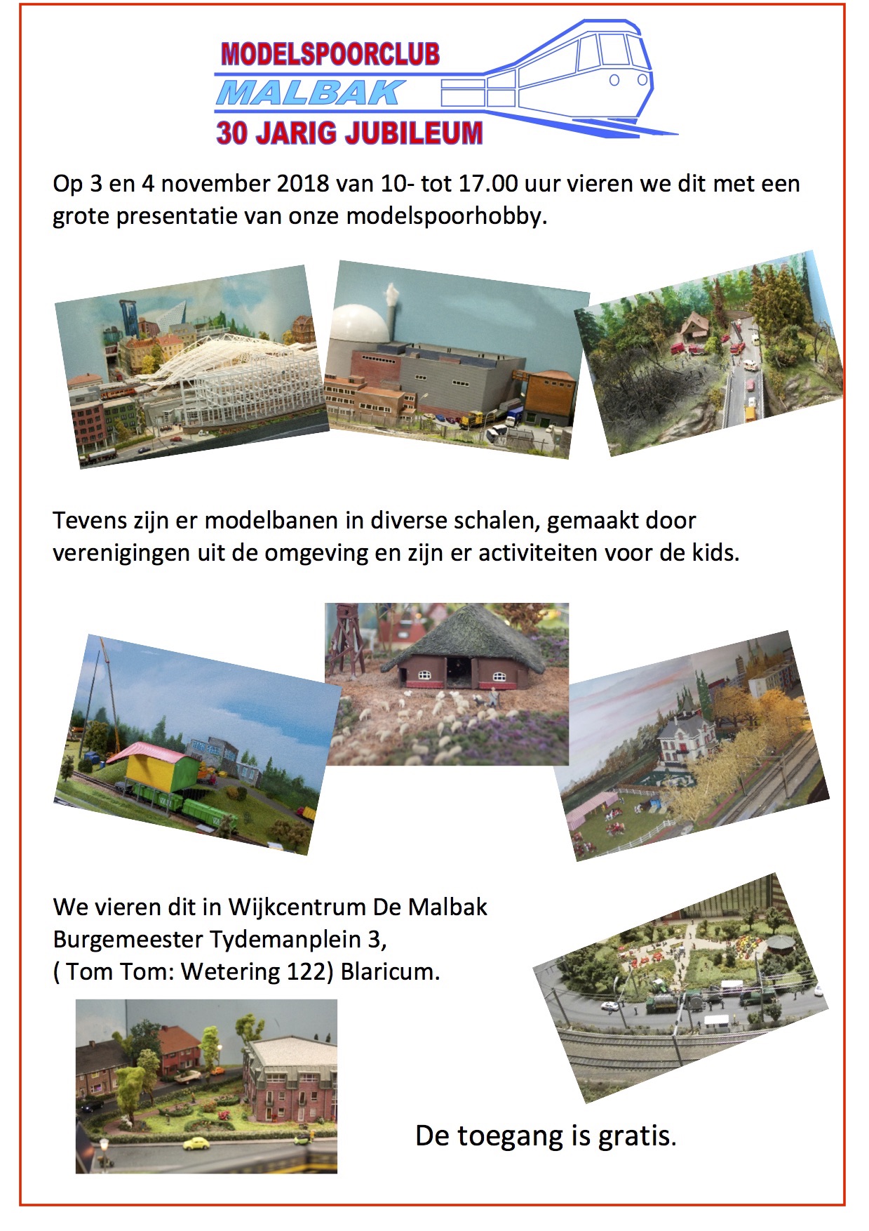 Om ons jubileum te vieren houden wij in De Malbak te Blaricum op 3 en 4 november open huis. De gehele Malbak zal dan vol staan met modelspoorbanen in verschillende schalen. Voor de kinderen zijn er ook diverse activiteiten. (zie de flyer als bijlage)