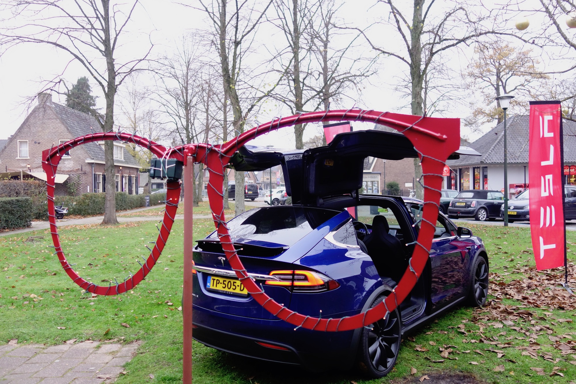 Een Tesla van dik een ton – ter opvrolijking van een fijne kortingsactie bij Optiek Boutique. Vanmiddag komt er ook een pianist.