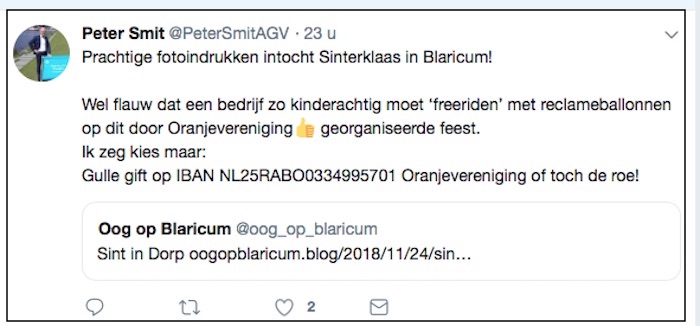 3. In de boom bij Gall&Gall is een van uw ballonnen door het lintje (!!! – zie boven) aan een tak blijven hangen. Laat u dat zo, of komt u morgen even met een hoogwerker om het ding te verwijderen? En wat doet u er dan mee? Nou, wijkagent Peter Knap liet zaterdagmiddag al weten geïnteresseerd te zijn in zo’n rode ballon – vanwege het milieu-beschadigende effect ervan.