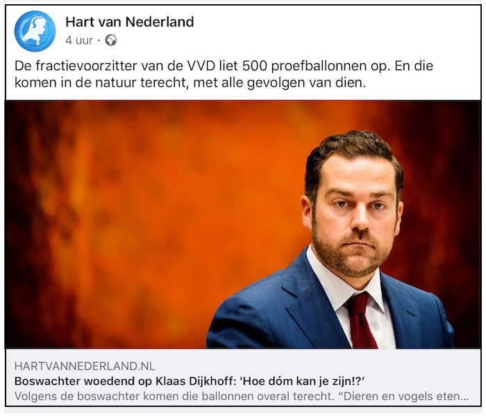1. Gisteren liet een groene (…) VVD’er 500 blauwe ‘proefballonnen’ op. Met kunststof lintjes en geplastificeerde tekstkaartjes. Hetgeen alom in den lande tot stevige afkeuring en grote boosheid heeft geleid. Niet in de laatste plaats vanwege die lintjes … – waarin vogels en andere dieren gemakkelijk verstrikt kunnen raken. Ook heel dom, dus. Oók, ja. Dóm, ja. Diplomatiek gezegd dan, hè …