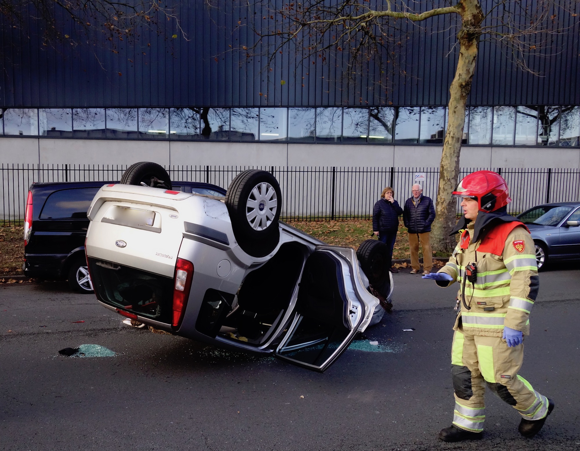 Ambachtsweg, Huizen, 14:35 uur: een grijze personenauto botste door onbekende oorzaak tegen een geparkeerde zwarte VW-bus en sloeg daarna over de kop. De bestuurder kon op eigen kracht zijn auto verlaten. De hulpdiensten werden massaal ingezet – het viel allemaal redelijk mee.